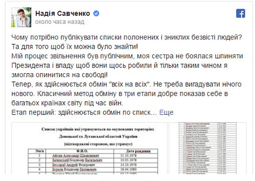 Несмотря на возражения СБУ, народный депутат Украины Надежда Савченко сегодня, 10 января, опубликовала на своей странице в Facebook списки пленных украинцев, которые находятся в плену или считаются пропавшими без вести на оккупированной территории Донбасса.
