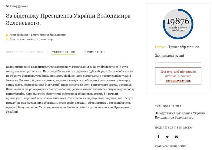 На сайте президента Украины 22 мая была зарегистрирована электронная петиция "За отставку президента Украины Владимира Зеленского" (№22 / 053360-ЭП), автором которой выступает Максим Безрук.