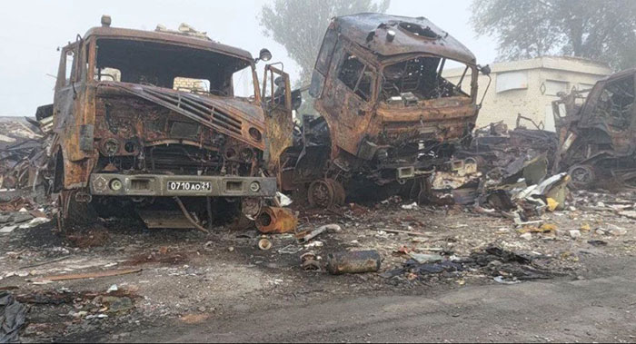 Але насправді це було лише одним з елементів удару. Бо навіть на кадрах знятих рашиськими пропагандистами видно, що було знищено низьку військових машин та споруд. Зокрема у кадр потрапила і машина супутникового зв'язку Р-439-МД2.