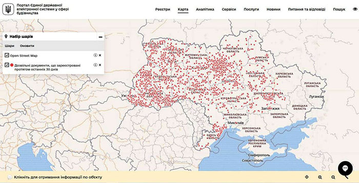 - публічна мапа будівництва. На ній відображаються нещодавно видані дозволи на проведення будівельних робіт;