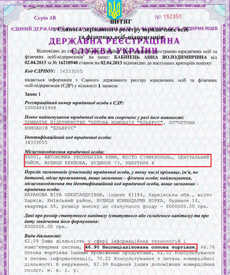 Как свидетельствует выписка из Госреестра, среди видов деятельности ЧП «Оптовая компания «Эльбрус» овощей-фруктов нет. Основной деятельностью указана «неспециализированная оптовая торговля».