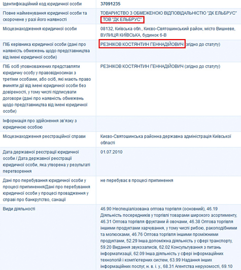 Полное название — ООО «Оптовая компания «Эльбрус». В СМИ она упоминалась как компания с годовым доходом в 1,5 млрд грн. По данным источников, за первое полугодие 2012 года прибыль компании выросла до 2,2 млрд грн. Она зарабатывает деньги или на скретч-картах, то ли на торговле овощами и фруктами, как настаивает ее руководитель Константин Резников.