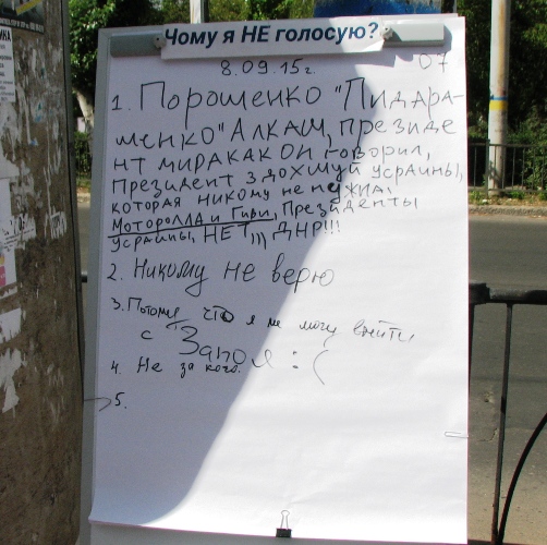 Двое молодых людей из палатки, называющих себя "социологами", предлагают прохожим выразить маркером на стендах свое отношение к будущим местным выборам. И вот что можно увидеть в итоге их "опроса".