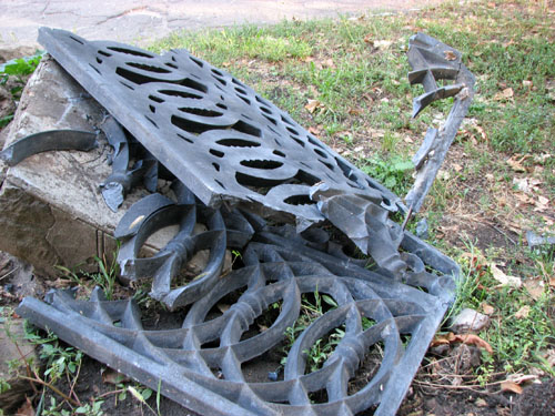 Металл достаточно хрупкий, но в основе конструкции находится металлический прут, который поддается ударам чего-то тяжелого сложнее. Поэтому, пососкалывав чугун с нескольких решеток, воры решили действовать наверняка, и теперь уже валят ограду целыми секциями.