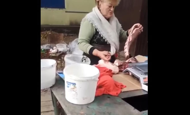 Как следует из видео, здесь происходила торговля рыбной продукцией, причем женщина-продавец использовала в качестве прилавка... мусорный бак.