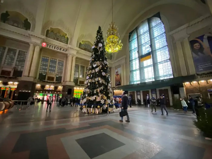 На центральному залізничному вокзалі у Києві встановили ялинку, яку можна освітлювати крутінням педалей.