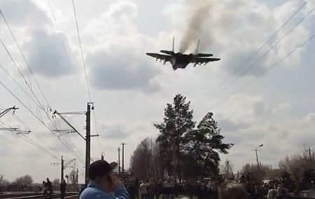 В Сети появилось видео, на котором МиГ ВВС Украины пролетает буквально над головами протестующих, заблокировавших колонну украинской военной техники в Краматорске.