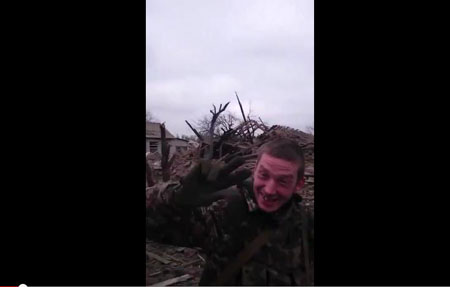 В Сети появилось видео, как террористы, прогуливаясь по улочкам частного сектора в Дебальцево, потешаются над разрушенными домами мирных жителей и ищут, чем бы поживиться.