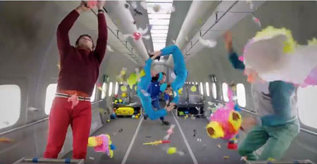 Видео начинается предупреждением о том, что оно снималось без применения спецэффектов. Кроме музыкантов в самолете, летящем в невесомости, находятся еще две ловкие девушки в костюмах стюардесс.