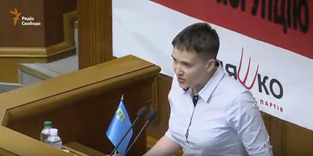После своей речи Надежда Савченко спела Гимн Украины, сняла плакат с парламентской трибуны со своим портретом и заменила его баннером "Свободу заключенным Кремля".