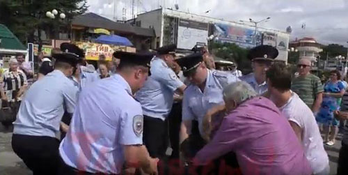 Инициаторы акции протеста против застройки набережной торговыми объектами планировали провести митинг, но, поскольку их заявка не была согласована с оккупационной "властью" города, решили изменить формат мероприятия и провести его как встречу с депутатом. "Встреча" продолжалась не более 5 минут, поскольку сразу же после начала сотрудники полиции схватили выступающего активиста, поволокли к машине полиции и швырнули внутрь как мешщик с картофелем. Вслед за ним на руках полицейских последовал и народный избранник. Остальные участники акции препятствовали задержанию, из-за чего полиции пришлось вызывать подкрепление. В результате правоохранители увезли двух участников встречи в ОВД, а активисты остались собирать подписи для петиции.
