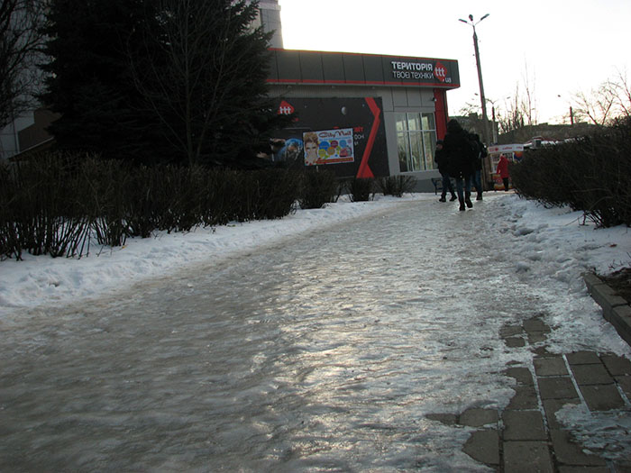 Сегодня для меня таким зрелищем стал увиденный на улице Дворцовой в Краматорске процесс посыпания тротуара. Точнее – ледяной корки на нем.
