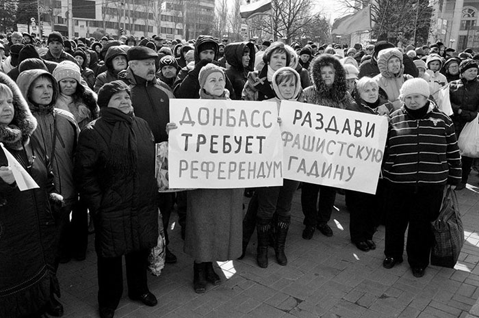 Лозунги на митинге были такие: "Слава Беркуту", "Раздави фашистскую гадину", "Донбасс требует референдум". Георгиевские ленточки были повсюду, а один человек даже пришел с собакой в попонке из российского флага. Перед пьедесталом стоял стол, на нем ― две коробки для голосования с надписью "Против фашизма", и каждый желающий мог участвовать в списках "За Союз с Россией" и "За референдум". Среди публики было очень много пожилых женщин, парней в камуфляже и мужиков в спортивных штанах.