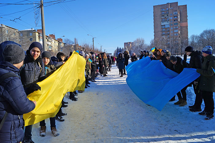 В честь праздника, сегодня в Краматорске прошла акция под названием "Єднаймося в живий ланцюг!", организованная некой "Фундацією Регіональних Ініціатив (ФРІ). Должен признать, и настаиваю: лучше бы эта "Фундація" вообще не бралась за дело и никакой акции не проводила. Потому что результат оказался для праздника оскорбительно убог.