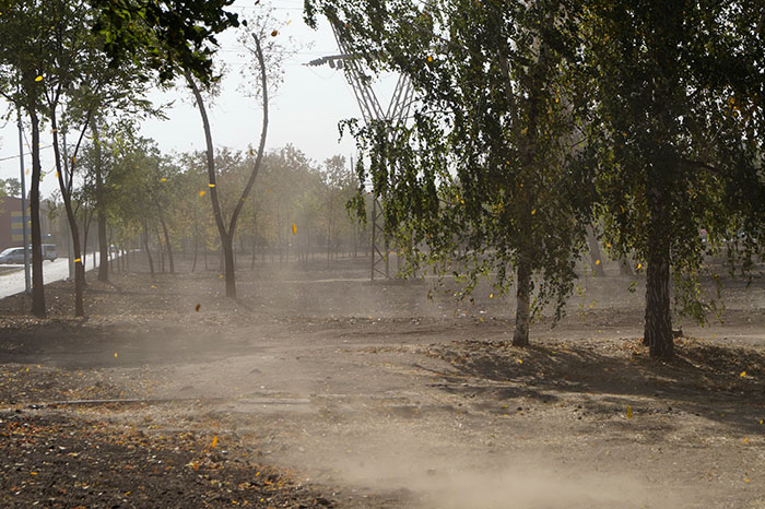 Пыль. Она по всей округе лежит уже толщиной в пару-тройку сантиметров, обувь буквально утопает в легком на подъем слое пыли. И - поднимает, да так, что при малейшем дуновении ветра, и проезжая часть по улице О. Тихого, и вся округа тут же скрывается в рыжей дымке.