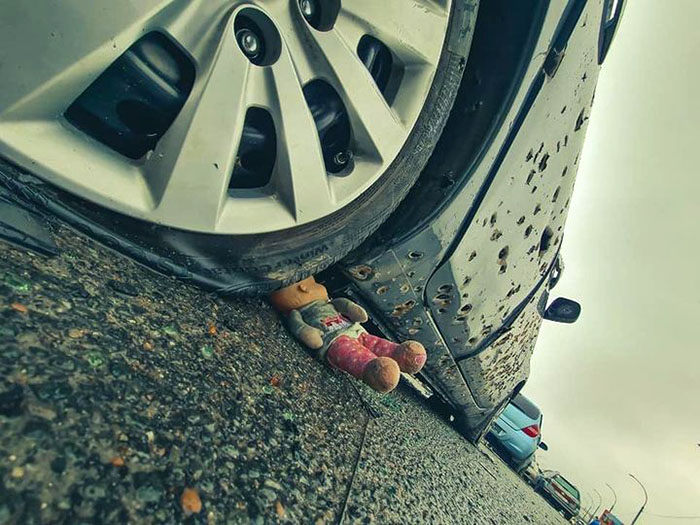 Буча. Вдоль улицы, через каждые 10 - 20 метров - трупы мужчин в гражданской одежде, у некоторых за спиной связаны руки. Вокруг голов намотана их же одежда. Все застрелены выстрелами в голову.