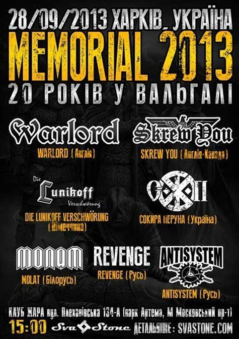 Концерт правой музыки «Memorial 2013» проходил в харьковском клубе «Жара», который по некоторым свидетельствам принадлежит структурам Геннадия Кернеса – нынешнего мэра Харькова. Если верить знающим харьковчанам, ранее парк Артема вместе со всеми развлекательными заведениями, включая клуб "Жара", контролировался известным регионалом Василием Салыгиным, но затем перешел под контроль группы Кернеса. Учитывая национальные корни последнего – мероприятие выглядело особенно пикантно, впрочем гостей из России едва ли интересовала национальность владельца клуба. На концерте выступали группы из Англии, Германии, Белоруссии, России и Украины, многие из которых имеют статус легенд правой сцены.