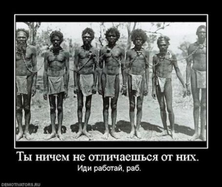 Что-нибудь принципиально изменится, кроме психологического восприятия рабом своей жизни? Ничего! А если внушать рабам каждый день, что они свободные люди, давать им бесплатные зрелища в виде концертов на центральных площадях, организовывать для них выборы, которые ничего не меняют, создать для имитации защиты прав рабов профсоюзы и т.д., то есть дать им иллюзию свободы и демократии? Многие рабы будут чувствовать себя счастливо, и даже гордиться достижениями тех, на кого они работают!