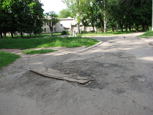 Второе фото того же самого места было сделано сегодня, 11 мая. Как видим, от засыпанной и прихлопнутой "нано-смеси" производства ЧП "Алатыр" мало что осталось, поэтому к упомянутой выше технологии местные жители добавили свой собственнный элемент: деревянный шматок неизвестного происхождения. Возможно, когда-то это было дверью буфета.