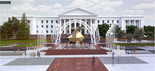 А что останется зимой от проекта-победителя, когда отключат фонтаны? Кони и кубик Рубика? Маразм просто. Во втором проекте и то больше смысла - он хотя бы соотносится с дворцом. А это золото - реально туркменский кич. Ещё бы коней в золоте изваяли... Просто ужас. Эпоха азиатского застоя.