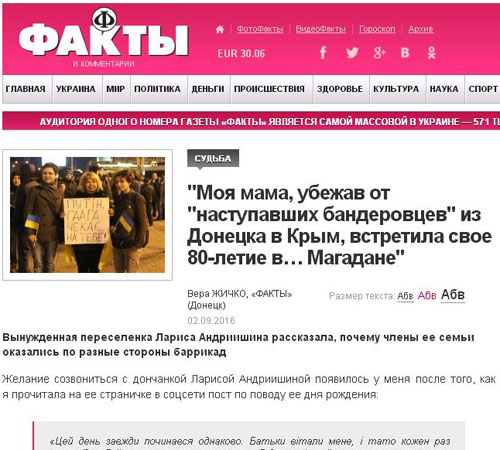Всеукраинское издание "Факты" опубликовало на днях статью "Моя мама, убежав от "наступавших бандеровцев" из Донецка в Крым, встретила свое 80-летие в… Магадане", в которой рассказывается о непростых судьбах донбасских семей, которые пережили внутренний раскол в результате трагических событий 2014 года.