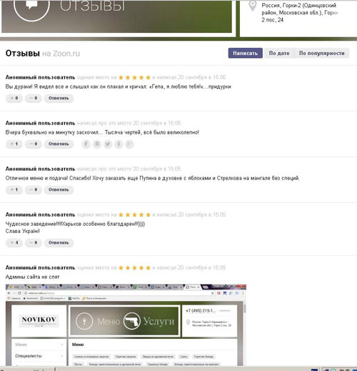 Раздел "Отзывы" на сайте подмосковного ресторана "Ветерок", где вчера, 19 сентября, был расстрелян неизвестным киллером глава так называемой Общественной организации "Оплот" Евгений Жилин, получил мега-популярность.