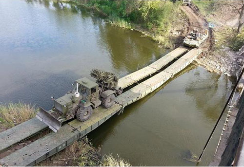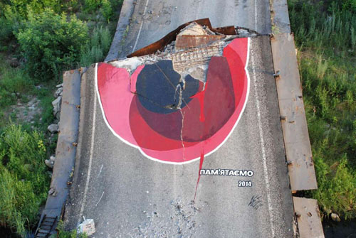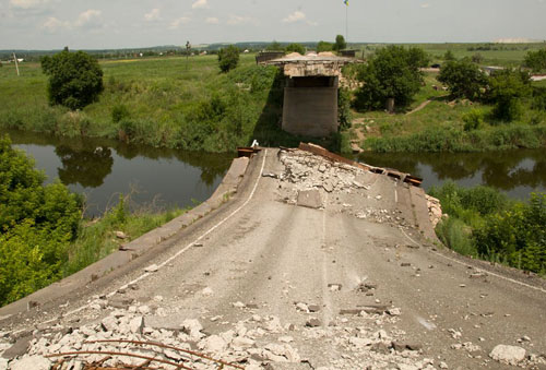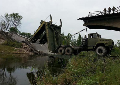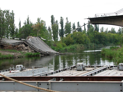 Мост был взорван боевиками "ДНР" 3 июля 2014 года. С тех пор, до сегодняшнего дня, движение по трассе в объезд взорванного моста производилось по понтонам.