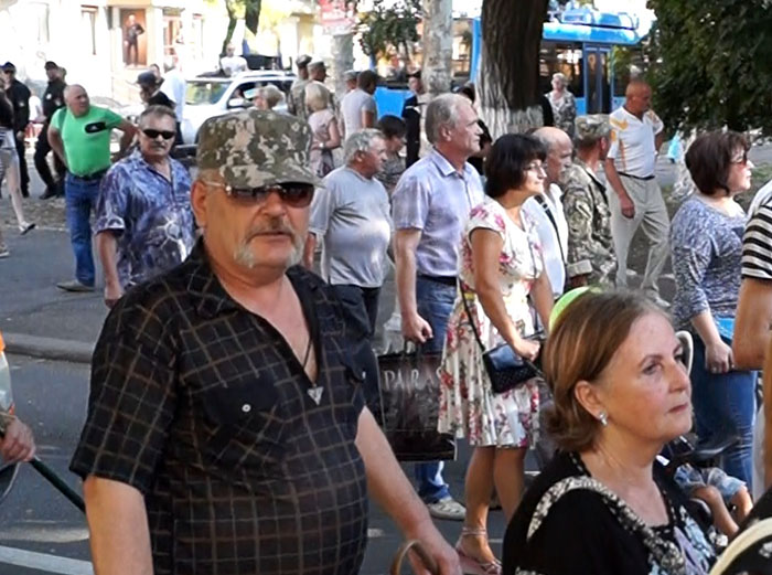 Все предельно просто. Фиксируя "ходу", сразу несколько фото- и видеорепортеров, в поисках удачного ракурса, расположились на пересечении улиц В. Стуса и Катеринича. В момент поворота колонны на Катеринича, в нее входит некий гражданин - с палочкой, с пивным пузцом, в шортах, в беленьких носочках, в кепочке под камуфляж и в темных очках.