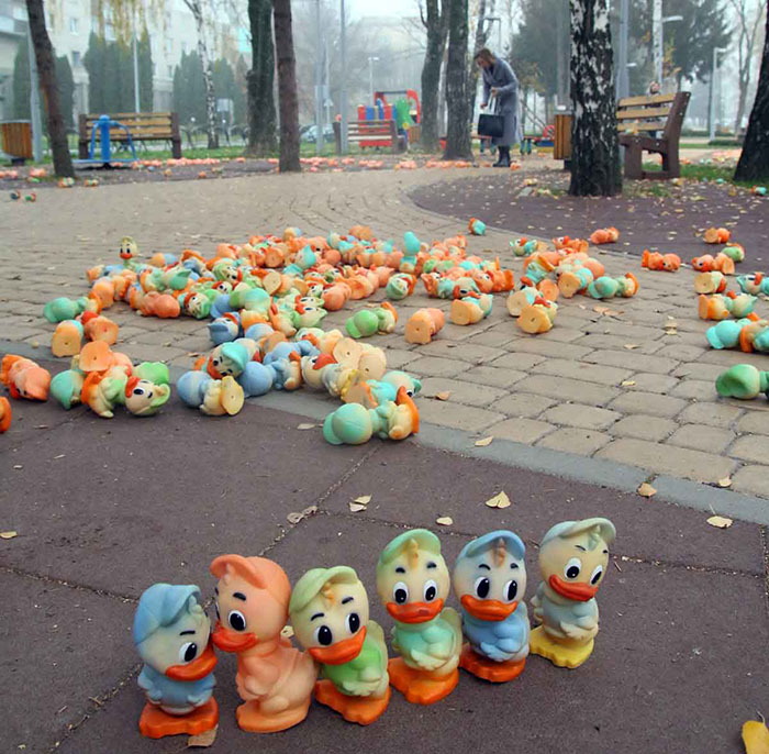 Шокирующее зрелище ожидало жителей Винницы ранним утром 5 ноября: на детской площадке на проспекте Космонавтов неизвестные разбросали тысячи резиновых игрушек "крякалок" - "утят", "собачек" и "котят".