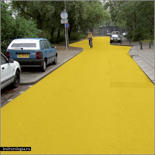 Иногда Флорентин отвлекается от своих скульптур и берется за краски. Но и здесь он не отступает от главного своего принципа: чем больше, тем лучше. Чего только стоит «синий квартал» Роттердама, предназначенный под снос и раскрашенный в ярко-синий цвет! Между прочим, благодаря этому приему район стал одним из самых привлекательных мест города для туристов. А еще Хофман покрасил в ярко-желтый цвет дорогу в одном из самых бедных городов Нидерландов – Сидхаме. Ведь желтый, как известно, символ богатства и благополучия.