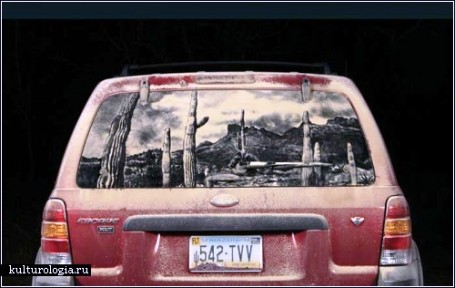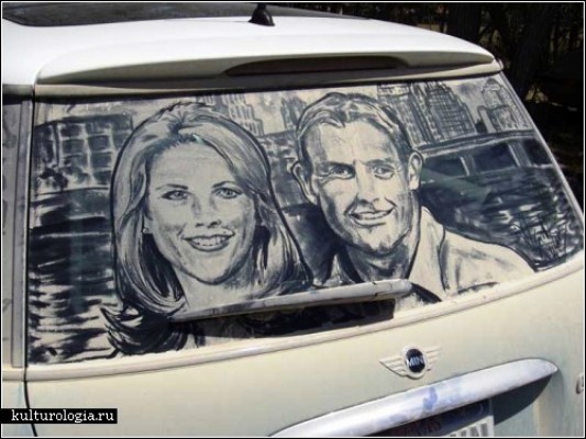 Легендарный американский художник по пыльным стеклам Скотт Уэйд (Scott Wade) редко моет свой собственный, не менее легендарный автомобиль Mini Cooper. Все свободное время он проводит за росписью таких же грязных машин, украшая их портретами, пейзажами, натюрмортами, карикатурами или же просто забавными картинками. Ищет на стоянках и парковках подходящий экземпляр - и вуаля!