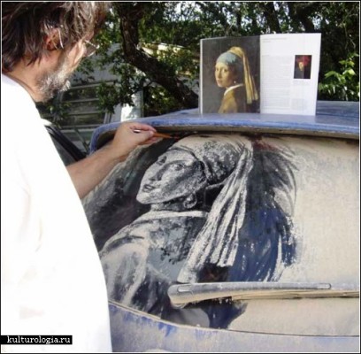 Лучше всего вооружиться кистью и щеточкой, ведь дорожная пыль - уникальное "сырье" для картин. Жаль только, доживут они до первого дождя или снега...