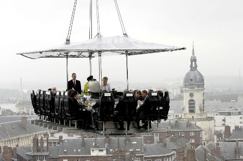 Амстердам, Париж, Барселона, Мадрид, Будапешт, Брюссель и многие другие города Европы готовы предложить вам это самое необычное мероприятие по приему пищи. 4 сотрудника обслуживающего персонала и 22 гостя могут разместиться на 7-тонной платформе, которая поднимается и опускается строго по часам и самое главное, работа такого аттракциона зависит от ветра.