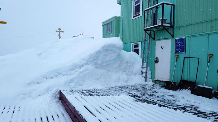 Зимовщики и участники сезонной экспедиции уже несколько недель освобождают территорию станции от снеговых заносов. Почти откопали жилой корпус, часовню и проход ко второму причалу.