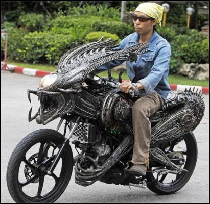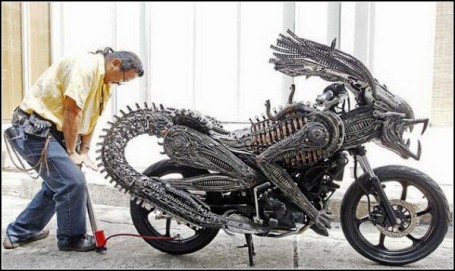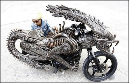 Весь этот металлолом, оказывается, был годен не только на переплавку, но и на создание из него чего-то нового, прекрасного и, главное, быстрого! Прекрасного, потому что мотоцикл Sci-fi Bike от Roongrojna Sangwongprisarn сделан в виде инопланетного чудовища из серии фильмов про Чужого. Нельзя, конечно, сказать, что это очень симпатичный персонаж, но в виде мотоцикла он выглядит, поистине, восхитительно!