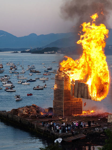 Олессун, Норвегия. На ежегодном фестивале в честь дня рождения Иоанна Крестителя, в этом городке зажигают самый большой костер в мире, сложенный из деревянных поддонов.