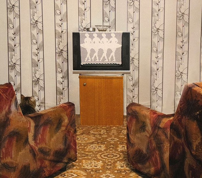 Або традиційна серветка для телевізора, але з балеринами з «Лебединого озера» (прозорий, як саме мереживо, натяк на революцію чи смерть лідера, яку художниця сподівається побачити по телевізору).
