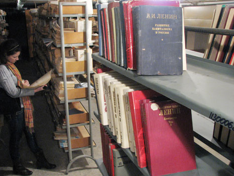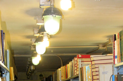 Книги в хранилище распределены по этажам. На первом (сверху) хранится то, что более востребовано, дублетный фонд (книги, имеющиеся во многих экземплярах) и раритеты.