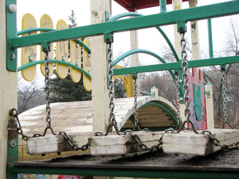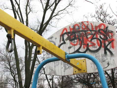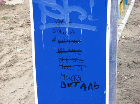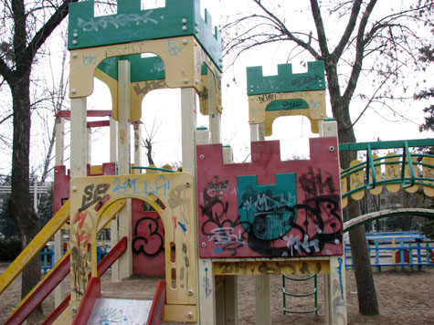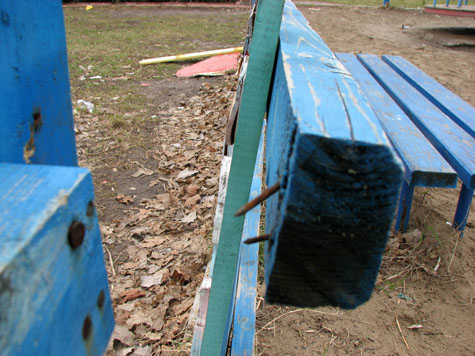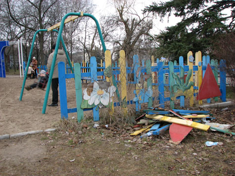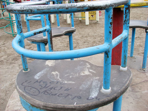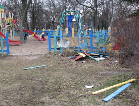 Детская площадка до сих пор выделяется ярким пятном в Сквере профсоюзов. Но при ближайшем рассмотрении выясняется, что дела здесь плохи. Совсем плохи. По той причине, что днем на площадку водят детей, а вечерами здесь по полной отрывается молодое пивное быдло. Каждое утро дворники выгребают с площадки кучи окурков, пивной тары и пакетов из-под сухарей и семечек. И любуются на то, какие новые разрушения принесла площадке минувшая ночь.