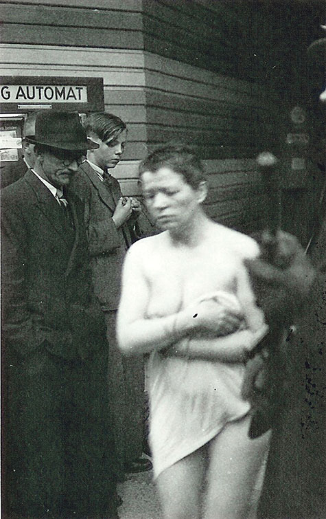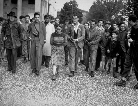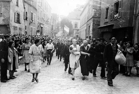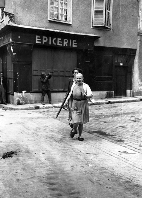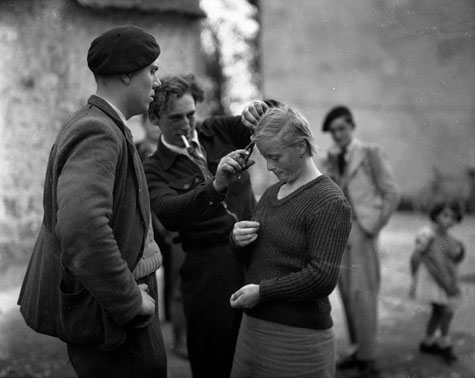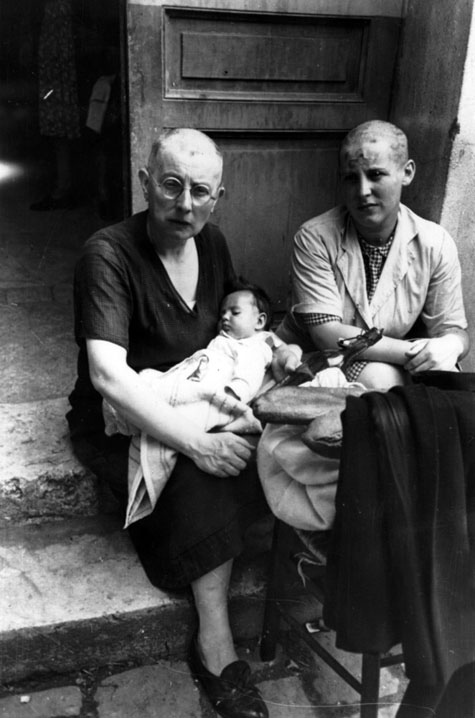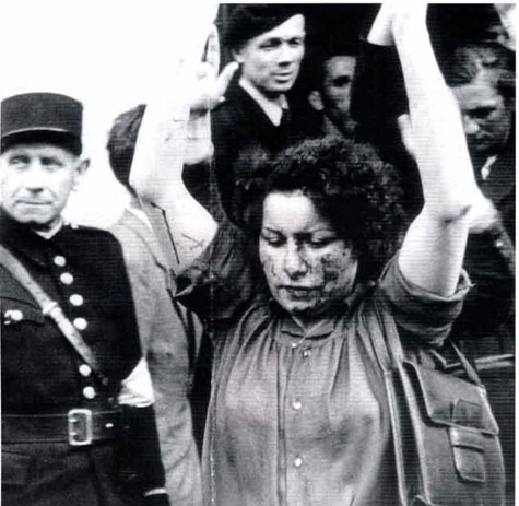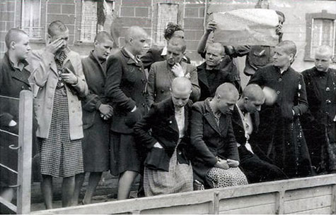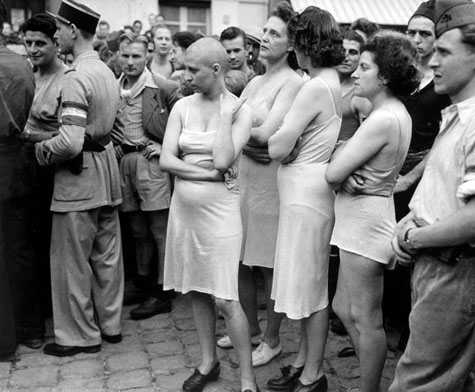4. Очевидец тех событий: "Мимо нас, под аккомпанемент ругани и угроз, медленно ехал открытый грузовик. В кузове было около дюжины женщин, все — с обритыми наголо головами, низко опущенными от стыда". Кадры хроники — олицетворением этих слов.