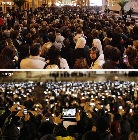 Есть уже набравшая популярность пара кадров, наглядно фиксирующая эту глобальную перемену. Вот толпа перед собором св. Петра в Ватикане в 2005-м, когда умер папа Иоанн-Павел II и был избран новый папа Бенедикт XVI. И вот ниже толпа на том же месте через 8 лет, в 2013-м, когда папский престол занял Франциск I.