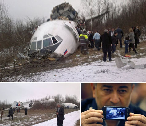 Но вот в 2010-м в Домодедово аварийно садится Ту-154. Сверху и слева внизу: фотографии, сделанные пассажирами после жесткой посадки их Ту-154 в Домодедово в декабре 2010. Справа внизу: автор верхнего кадра, обошедшего все ленты мировых информагентств, со своим мобильником. Два человека погибли и несколько были ранены в этом инциденте.