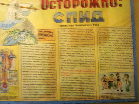 Один из таких плакатов размещен в КВД аккурат возле входа в лабораторию для сбора анализов. Именуется он "Осторожно:СПИД". Сначала мое внимание привлекли забавные рожицы в углу. А потом я вчитался в написанное от руки и вещаемое.
