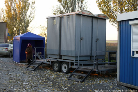 6. Туалет привезли только сегодня, бесплатный. Бабулька будет дежурить рядом с ним в этой синей палатке всю ночь, утром ее сменят.