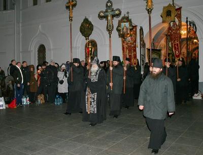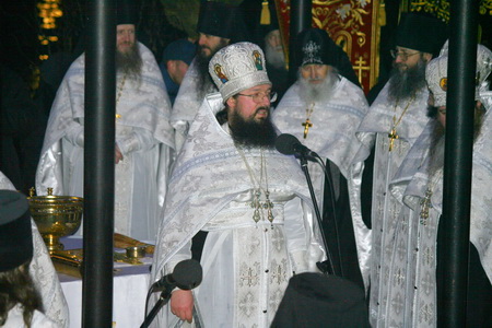 Многолюдно в святой обители было уже с позднего субботнего вечера. Праздник с нуля часов начался с Божественной литургии в Свято-Успенском кафедральном соборе. В шесть часов священники Лавры во главе с благочинным, архимандритом Галактионом крестным ходом спустились в специально оборудованную водосвятную часовню, ступени от которой поднимаются к Свято-Покровскому храму обители. И провели чин освящения воды.