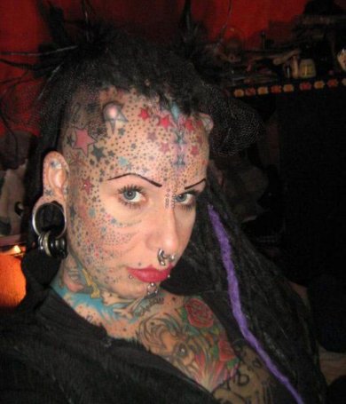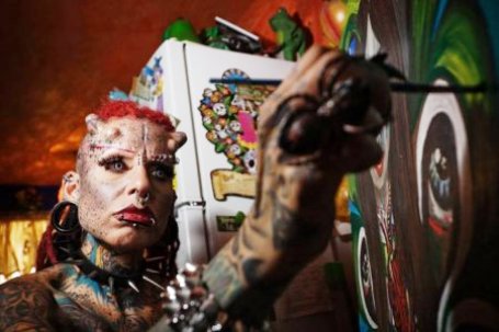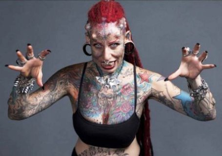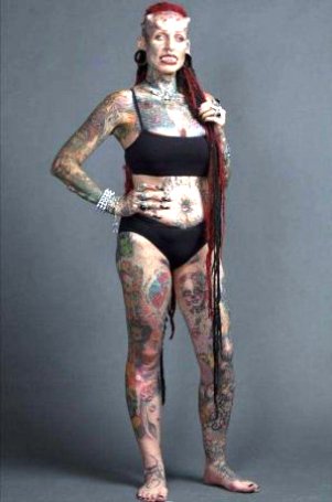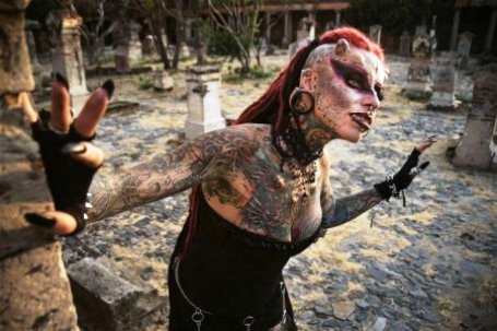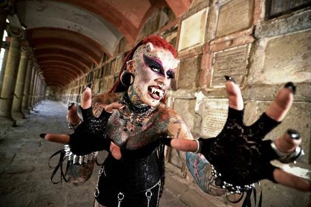 36-летняя мексиканка Мария Хосе Кристерна метит в книгу рекордов Гиннеса за свои нечеловеческие эксперименты с собственным телом и лицом. Мамаша четверых детей вдруг захотела превратиться… в вампира, модный нынче образ. Женщина вживила себе имплантаты, деформирующие лицо, и покрыла все тело татуировками.