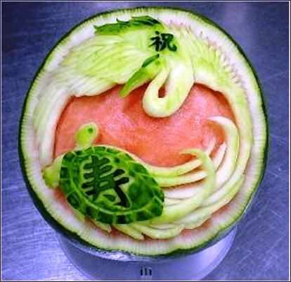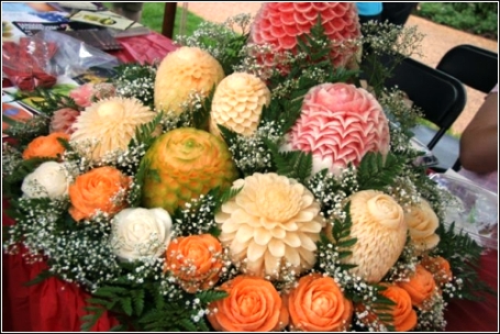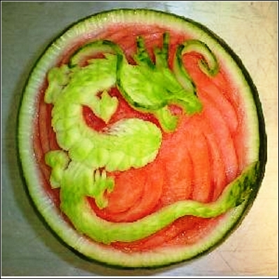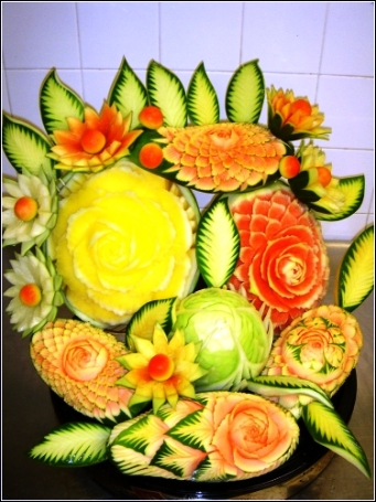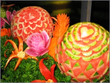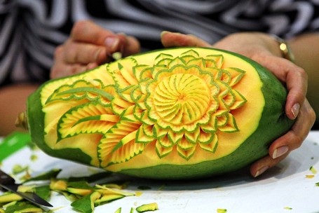 Сырьем для художников послужили дыня, папайя, огурец, тыква, капуста, морковь и редька, а вместо кисти - специальный остроконечный нож-резец. На воплощение планов и фантазий в фруктово-овощную плоть было отведено всего четыре часа: карвинг не терпит копуш!