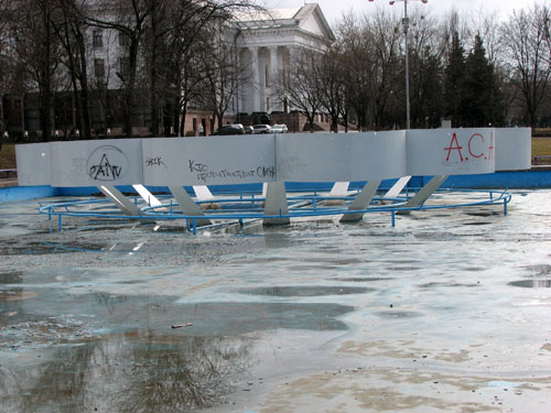 Внешний вид сегодняшнего центрального городского фонтана практически ничем не отличается от того, как всё это выглядело дло ремонта. Почти половина бетонного основания чаши искрошено и растрескалось, трубы в ржавчине. И это - всего лишь за неполные полгода после капитального ремонта, на который было потрачено 544.000 гривен! При том, что зима в этом году не баловала ни обильными осадками, но сильными морозами.