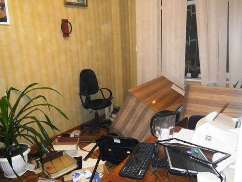 Основная техника спасена еще заранее, информация сохранена. В принципе, унесли на вскидку - один системный блок, огнетушитель, может еще что-то, утром будем разбирать завалы, посмотрим еще что, но многое уничтожено, в частности, побиты мониторы, перевернута документация. Убытки не на одну тысячу баксов... Эх, вежливые люди..."