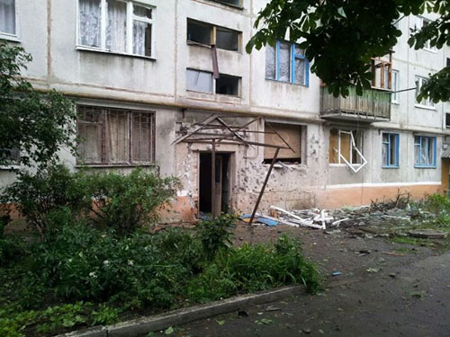"Вчера, в 20-35? по нашему району были выпущены 4 снаряда, кто и за чем???, здесь живут только мирные люди, нет ни банков и предприятий. Один магазин и второй ларек на 7-8 тыс. людей? - пишет краматорчанин Николай Брежнев, автор фотографий.- 2 снаряда попали в районе местного базара, снес забор, третий попал в метре от первого подъезда дома 143, снес входные двери, окна первого этажа, пробил газопровод в трех местах и стекла по вылетали с 1 по 5 этаж в трех подъездах.